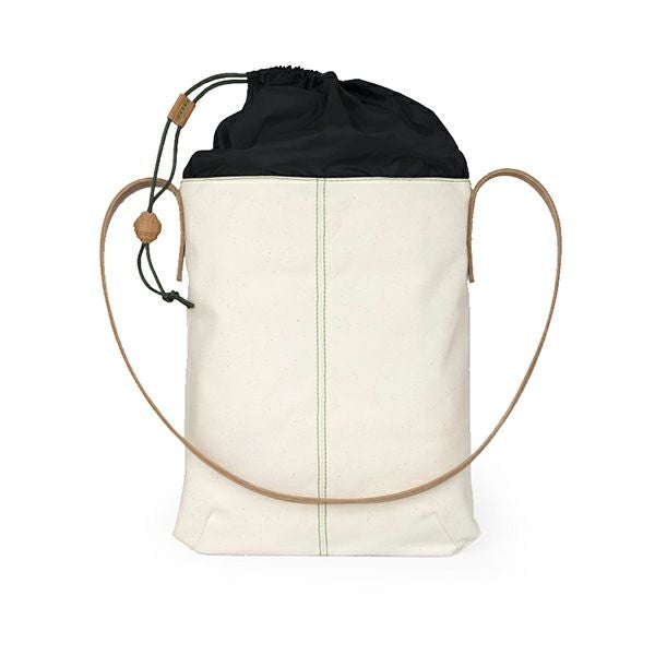HJバッグは日常使いに最適でありながら、インダストリアルデザイナーのヘラ・ヨンゲリウスの特徴である繊細でいて工芸の要素を持つディテールが随所に散りばめられています。機能的なUの字型のショルダーバッグ本体にはフランス産のワックスコーティングされたコットンキャンバス地を用い、上部の切り替え部分には対照的なナイロン地にレザーのストラップ。そしてワックスコーティングされたコードの固定にはオーダーメイドのレザーボタンが使われています。