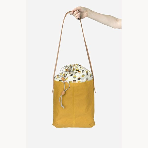 HJバッグは日常使いに最適でありながら、インダストリアルデザイナーのヘラ・ヨンゲリウスの特徴である繊細でいて工芸の要素を持つディテールが随所に散りばめられています。機能的なUの字型のショルダーバッグ本体にはフランス産のワックスコーティングされたコットンキャンバス地を用い、上部の切り替え部分には対照的なナイロン地にレザーのストラップ。そしてワックスコーティングされたコードの固定にはオーダーメイドのレザーボタンが使われています。