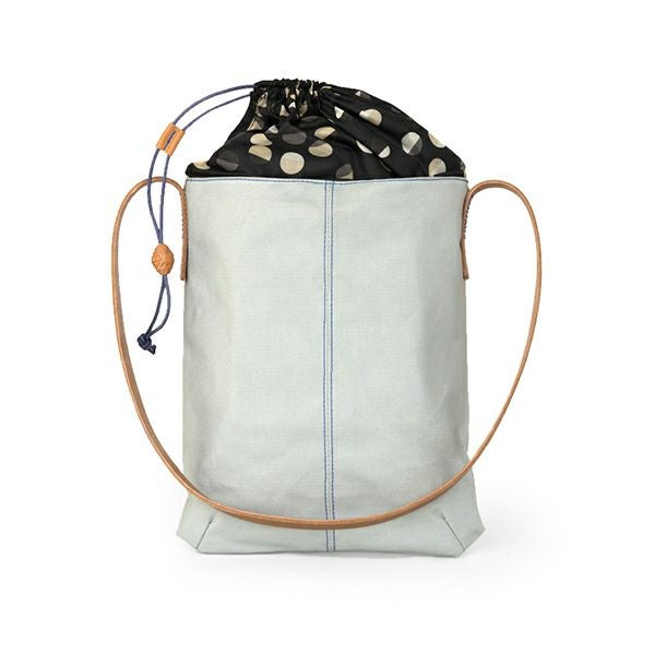 HJバッグは日常使いに最適でありながら、インダストリアルデザイナーのヘラ・ヨンゲリウスの特徴である繊細でいて工芸の要素を持つディテールが随所に散りばめられています。機能的なUの字型のショルダーバッグ本体にはフランス産のワックスコーティングされたコットンキャンバス地を用い、上部の切り替え部分には対照的なナイロン地にレザーのストラップ。そしてワックスコーティングされたコードの固定にはオーダーメイドのレザーボタンが使われています。