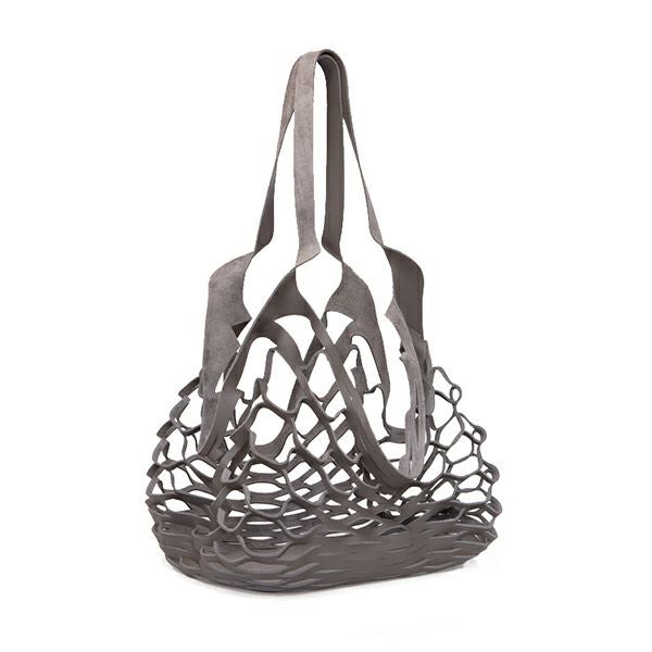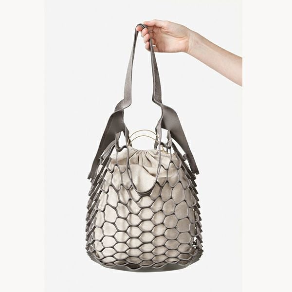 ニューヨークでプロジェクトナンバー8(Project No.8)」を展開するクリエーターデュオ、ヴァリアス・プロジェクツ「VARIOUS PROJECTS」がデザインしたマーケットトートは、平らな1枚のレザーからネット状のバッグに変形したくさんの荷物を収納することができます。バッグの中には着脱可能なベルギーリネンのポーチがついておりワックスコーティングされたコードを締めれば中身を落とす心配がありません。レザーはマハラム社がもっとも信頼する本質的なレザー品質「Stark」を使用しています。