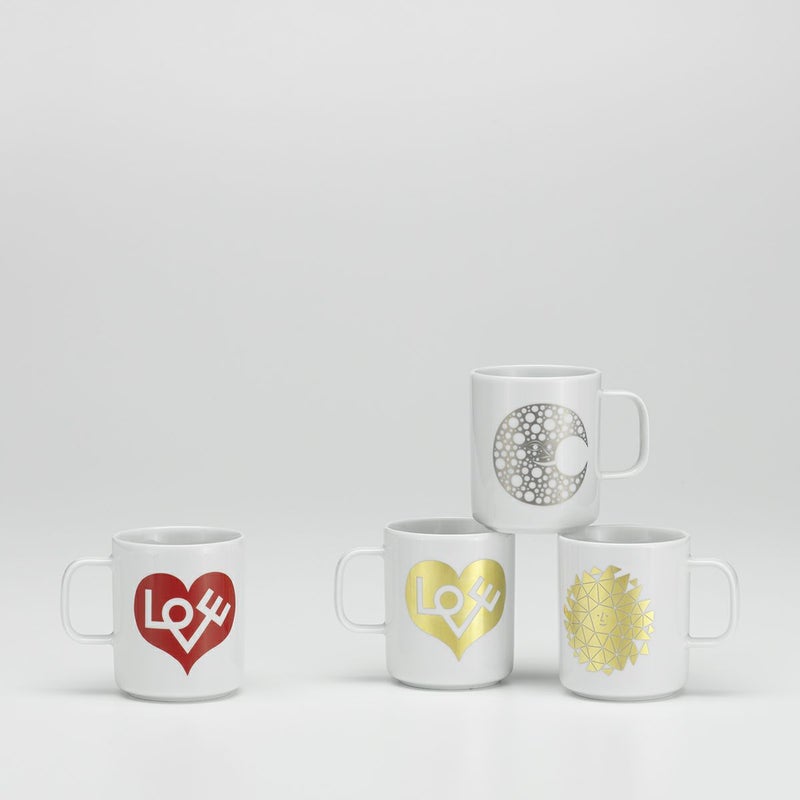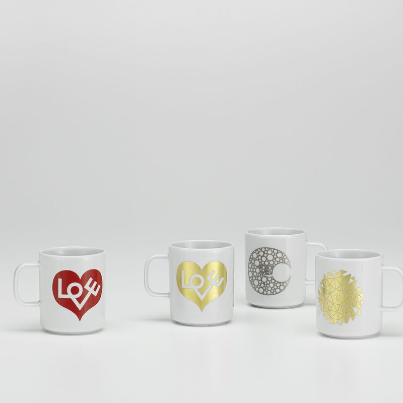 「コーヒー マグ」に用いられた「ラブ ハート」や「サン」などのモチーフは、現代のあらゆる暮らしの場面をさりげなくも豊かに彩るように、アレキサンダー・ジラードのレストランにまつわるデザインを起源としています。