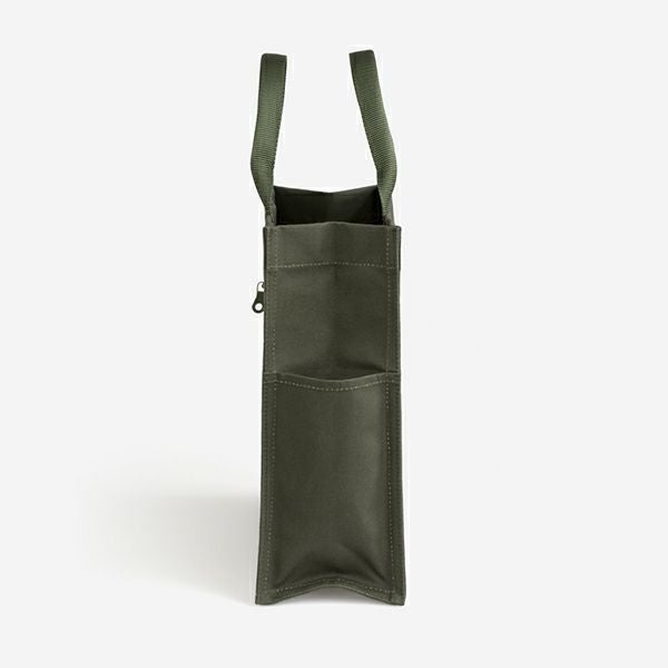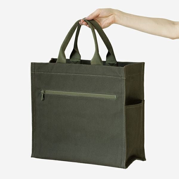 バッグ本体 : ワックスドコットンキャンバス / ハンドル:ナイロン / ジッパー開閉式トップ / 4つの外ポケットつき