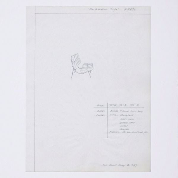 ハーマンミラーのデザインディレクターだったジョージ・ネルソンが率いたネルソンオフィス制作の家具のドローイングです。ドローイングは、ブループリント図面で、素材情報やサイズ、また設計変更まで言及したものもあり、1946年から1970年までの間、ハーマンミラーが製品化した多くのプロダクトのデザインガイドとなりました。