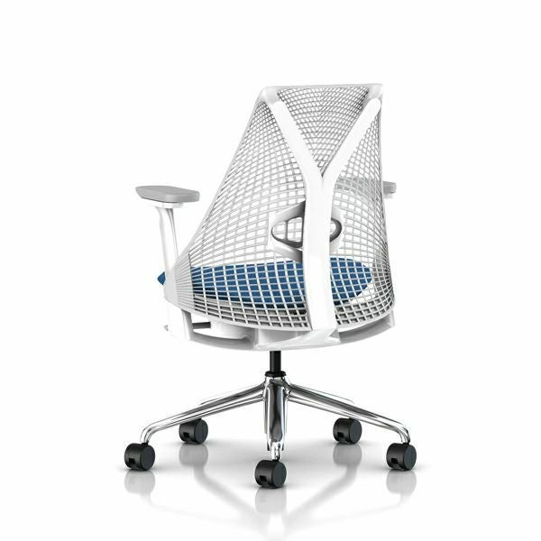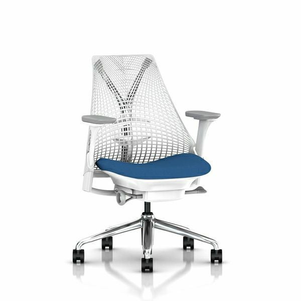 セイルチェア セイルチェアアーム:フルアジャスタブルアーム/サポートオプション:ランバーサポートなし/ベース&フレーム:ポリシュッドベース、ホワイトフレーム/キャスター:堅床・カーペット兼用/サスペンションフィニッシュ:スタジオホワイト/アームフィニッシュ:フォグ/張地:ファブリック(メドレー:ベリーブルー)