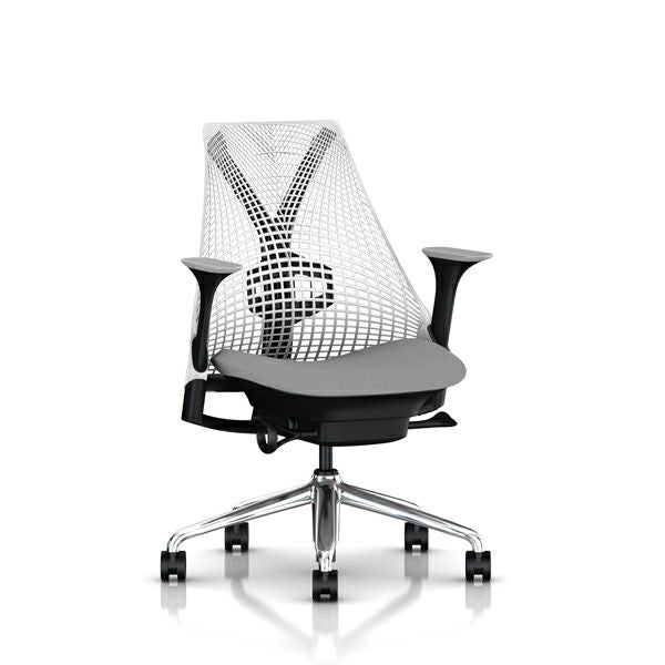 セイルチェア セイルチェア アーム:アジャスタブルアーム/サポートオプション:ランバーサポートあり/ベース&フレーム:ポリッシュドベース、ブラックフレーム/サスペンションフィニッシュ:スタジオホワイト/アームフィニッシュ:フォグ/張地:ファブリック(メドレー:フェザーグレー)